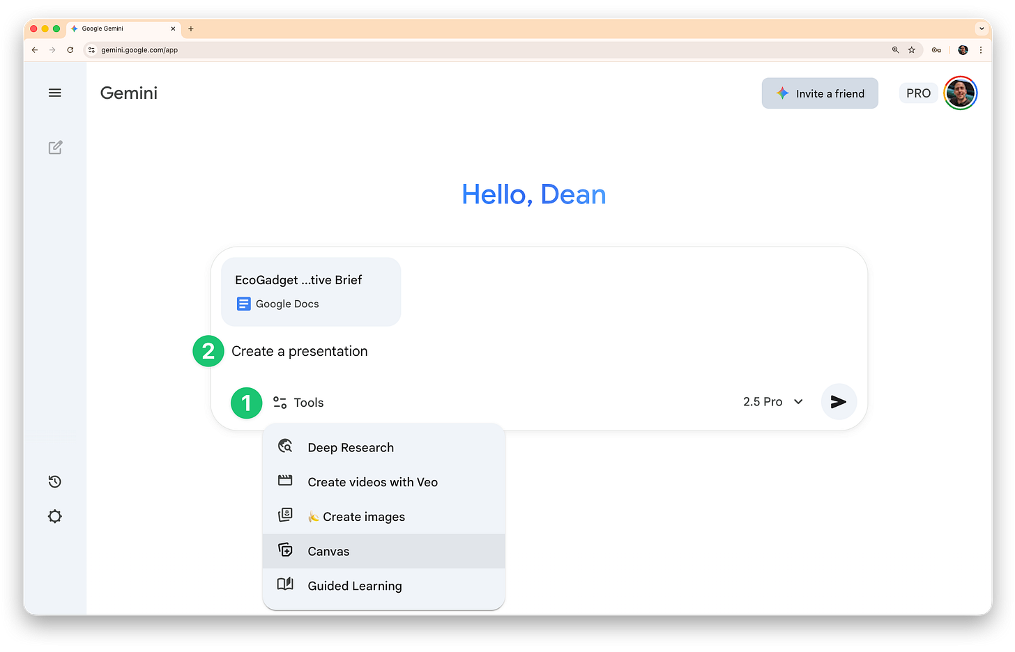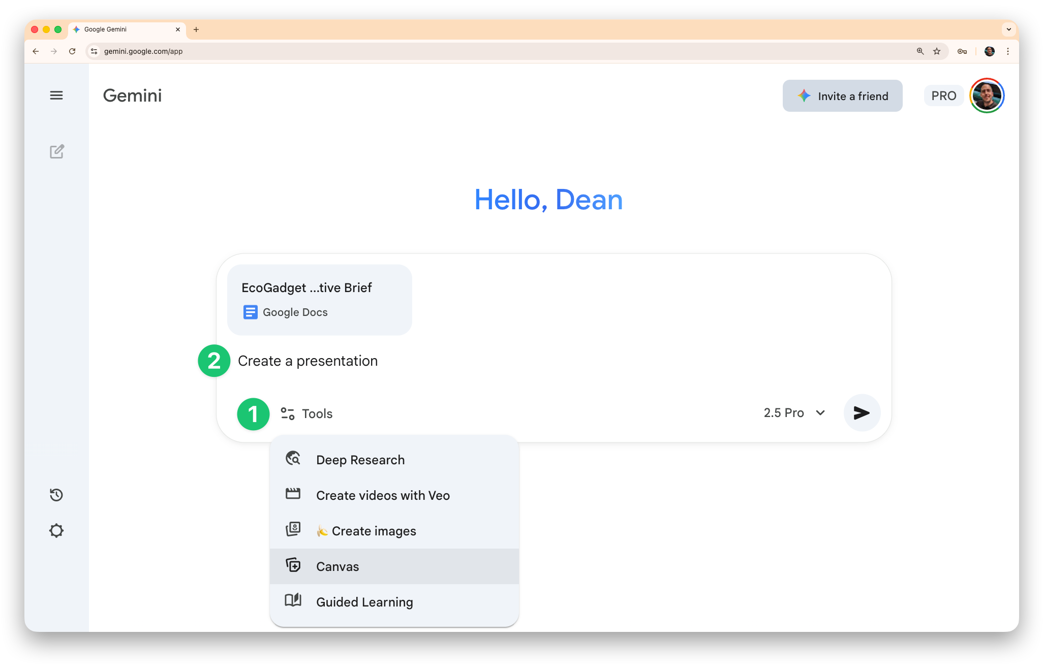 Go to Gemini, click the ‘Tools’ menu and choose ‘Canvas’