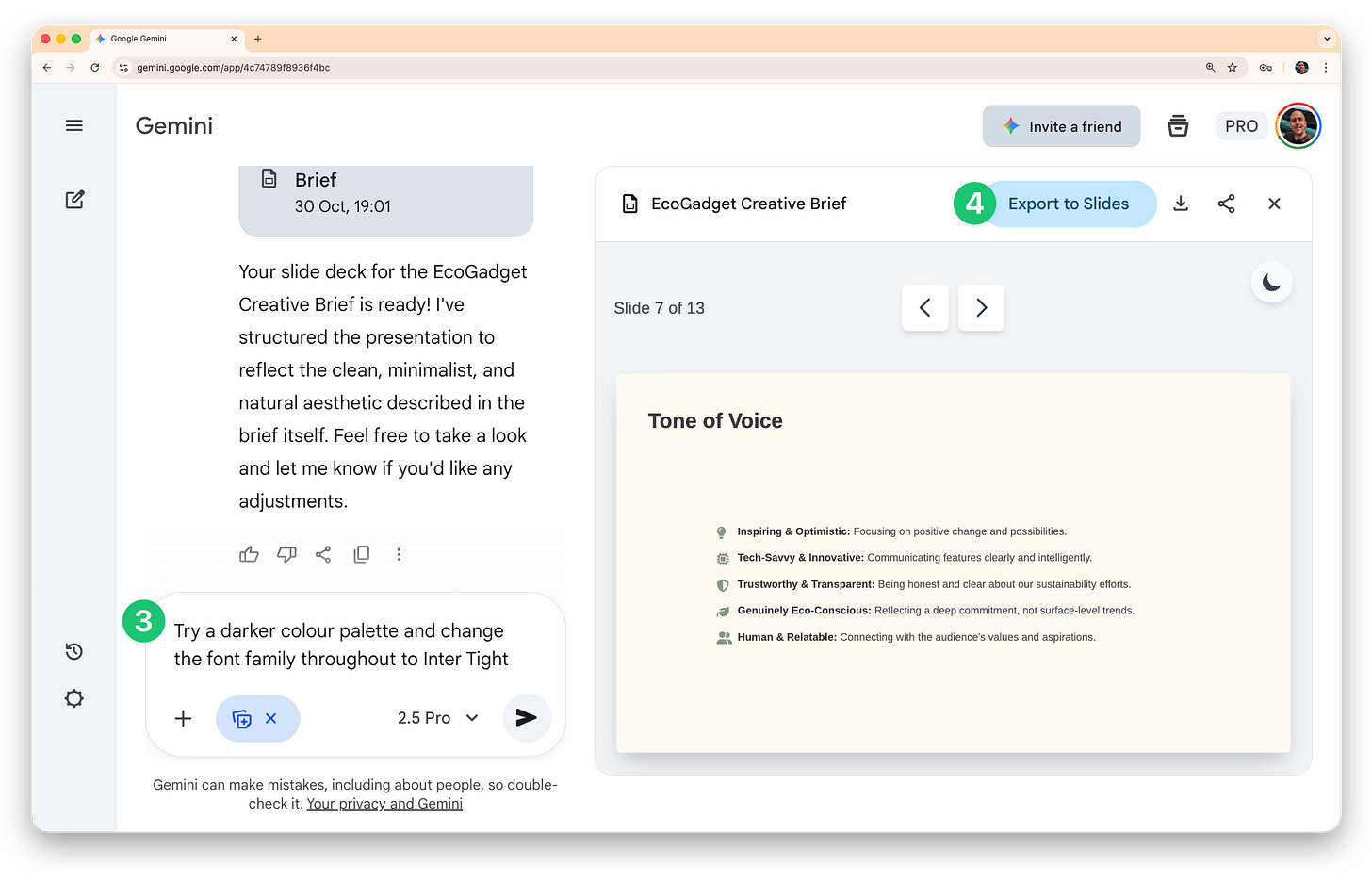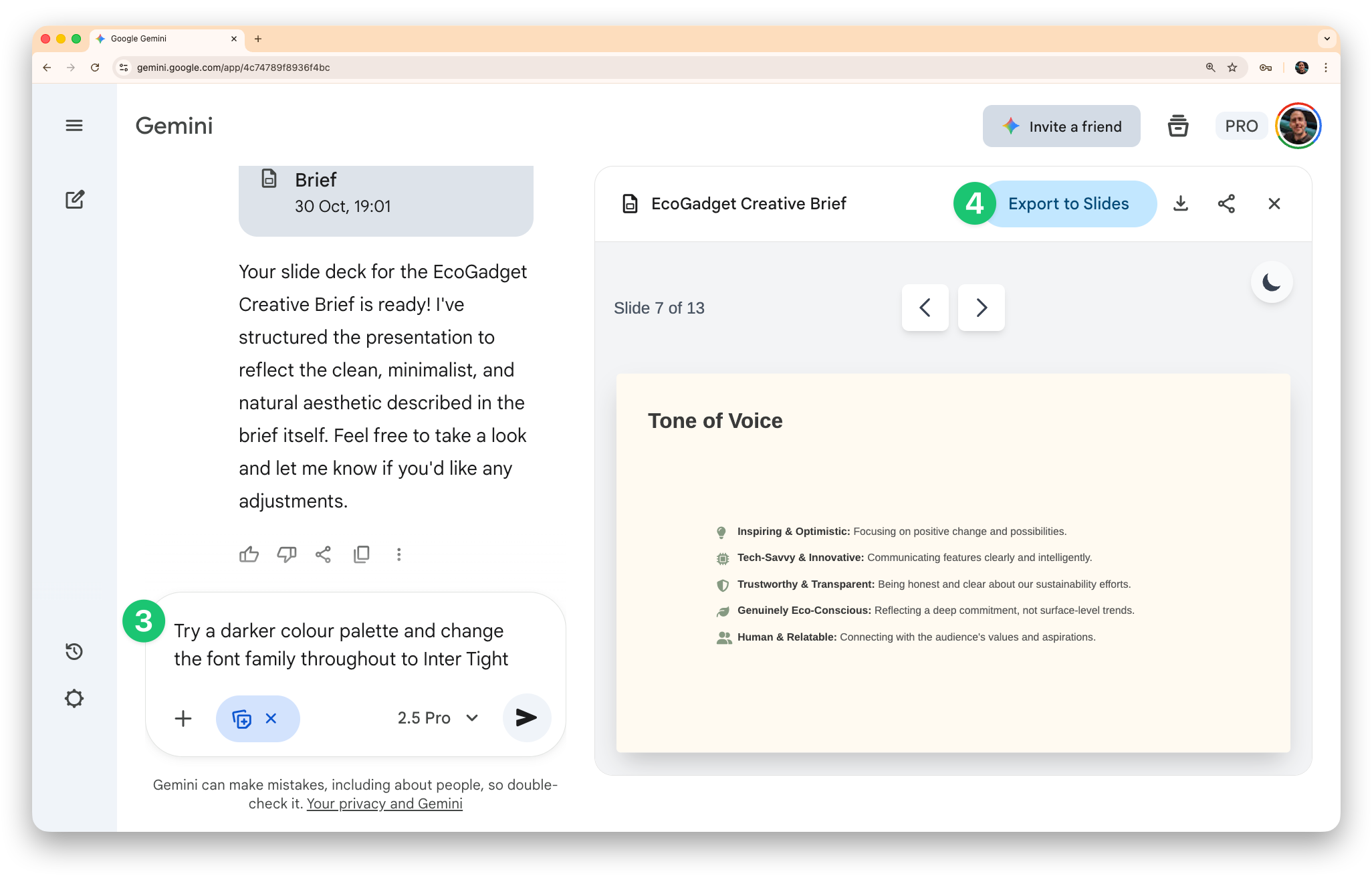 [Optional] Write follow up prompts to have Gemini make edits (e.g. adding/removing slides/info, updating the design, etc)