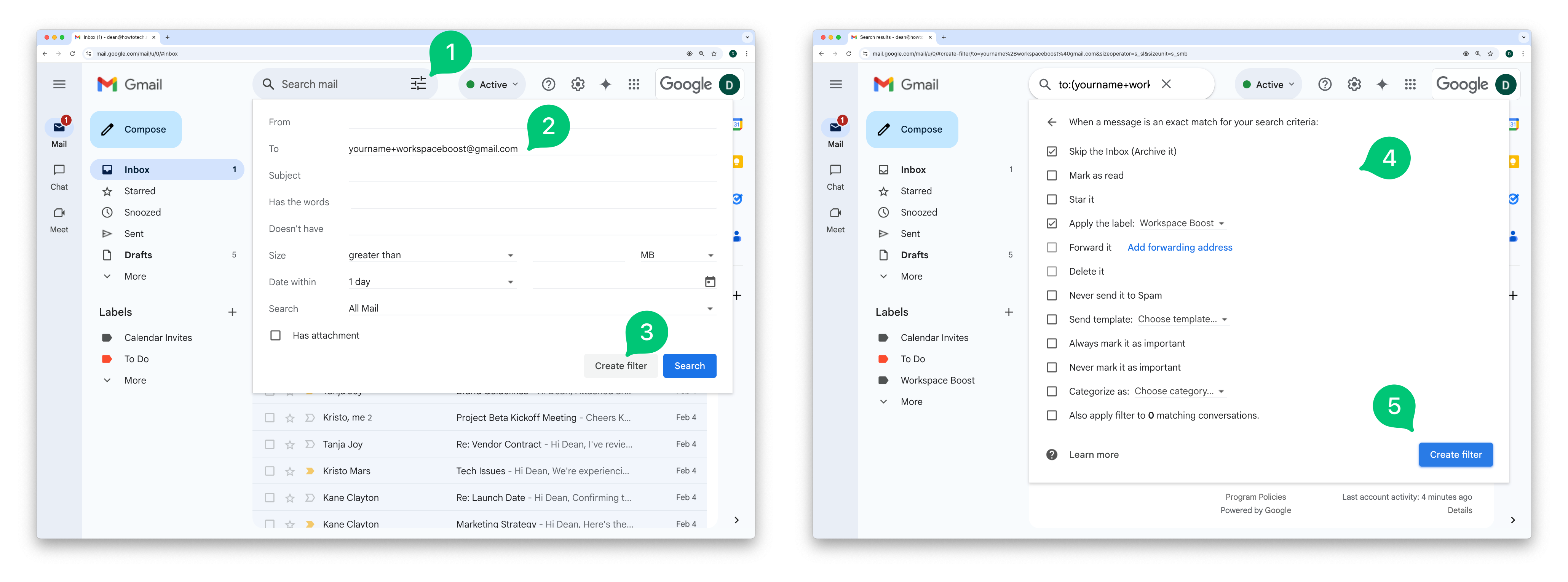 Choose what you want Gmail to do with these emails (e.g. 'Apply the label: Workspace Boost', 'Skip the Inbox (Archive it)', 'Mark as read', etc)