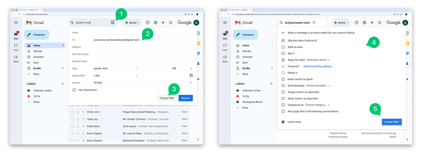 I’m using @gmail.com in these examples, but this will work with your custom Workspace email addresses, too (e.g. dean+newsletters@workspaceboost.com).