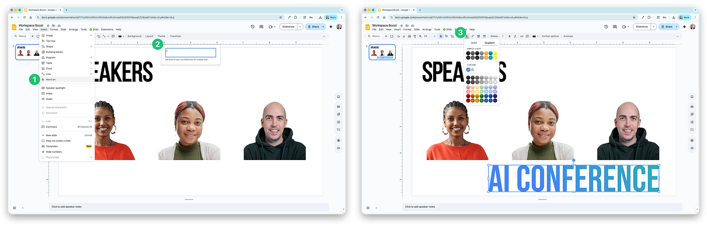 Finally, gradient colours are back on-trend, especially when talking about AI. Slides supports gradients in shapes but not for text. To create gradients with text, use Word Art instead.