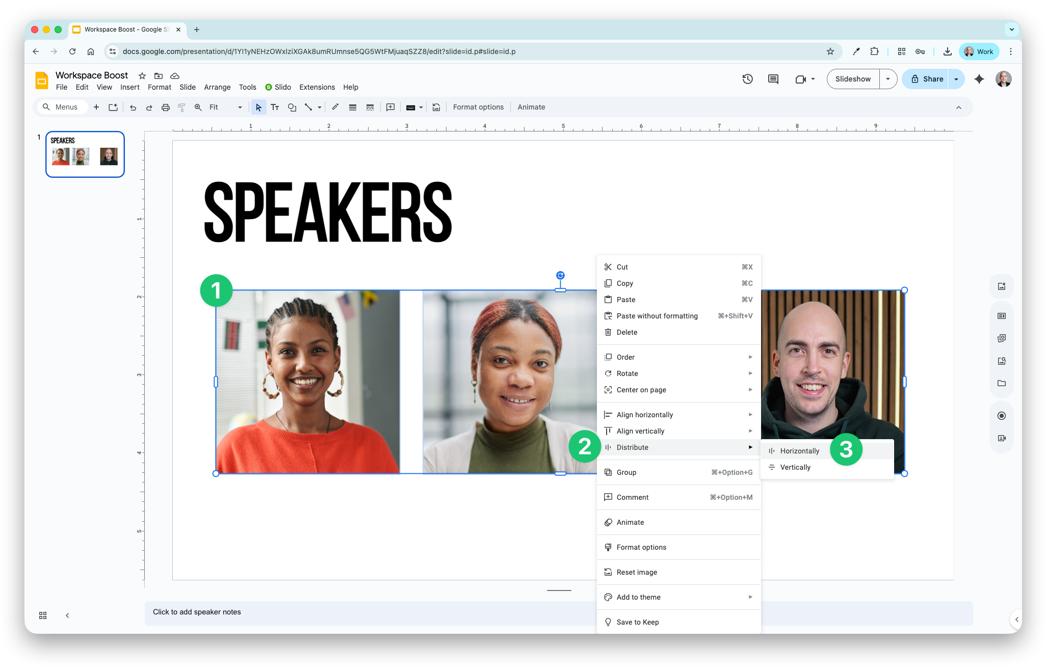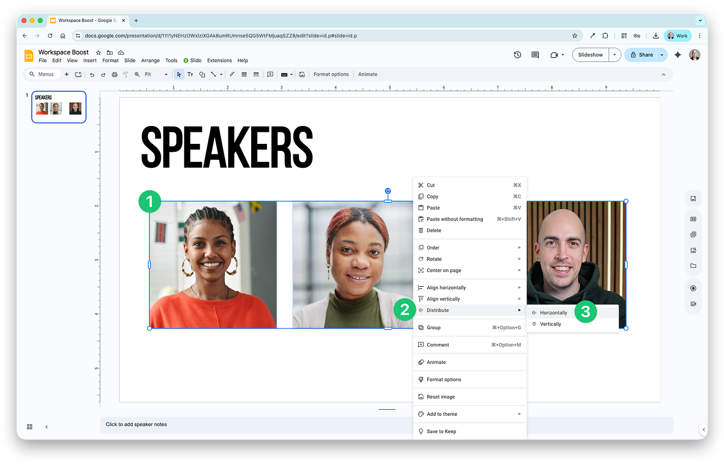 Similarly, often we need to click and drag items like headshot images to evenly space them. Again, no need - just do this instead: